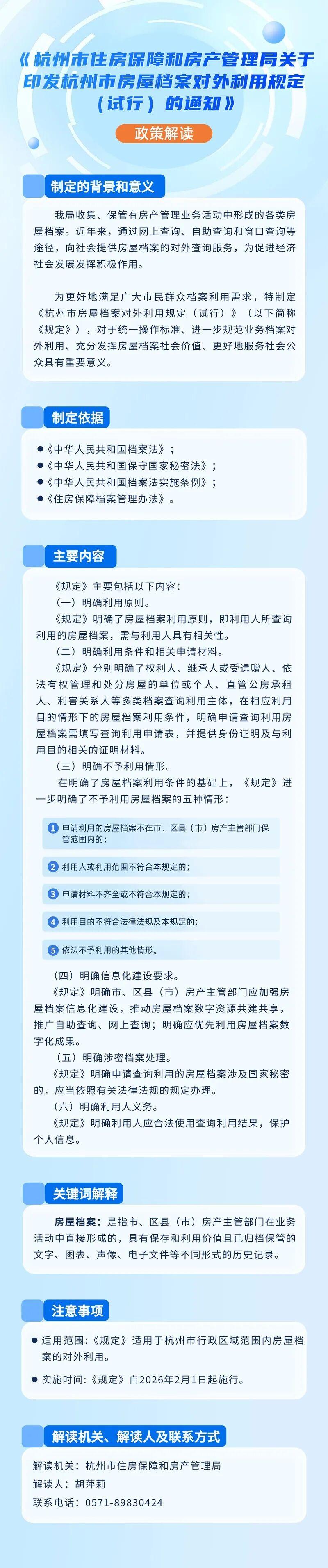 为了加强房屋档案的保护和利用,充分发挥房屋档案的价值,更好地服务社会公众,日前,市住保房管部门制定下发了《杭州市房屋档案对外利用规定(试行)》,自2026年2月1日起施行。