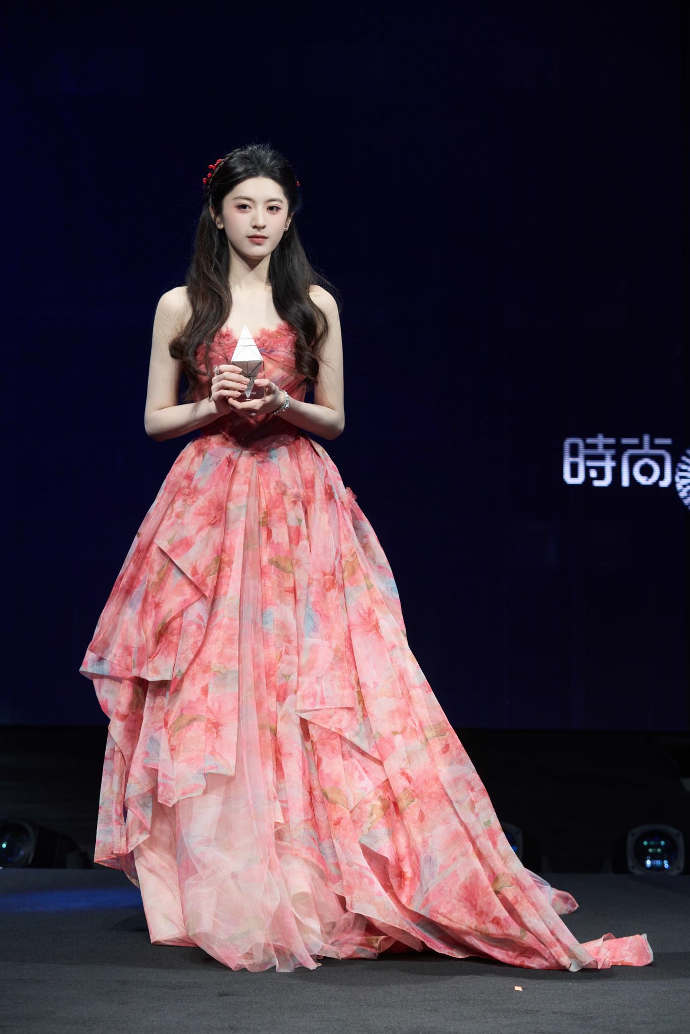 而真正的高光时刻,属于颁奖礼台。当苏棋的名字被郑重念出,聚光灯如命运般汇聚。水红色长裙恰似朝霞浸染的第一缕云霭,明媚而不失雅致。长长的裙裾在身后迤逦铺展,随着她轻盈的步态,拖尾如灵动的羽翼般飘逸摆动,仿佛林间精灵踏入凡尘的庆典,于华丽殿堂中注入一抹灵动的生机。从星河的清冷到花霞的暖艳,两套造型宛若她演员身份的一体两面:既可承载深邃的故事,亦能绽放灼热的生命力。