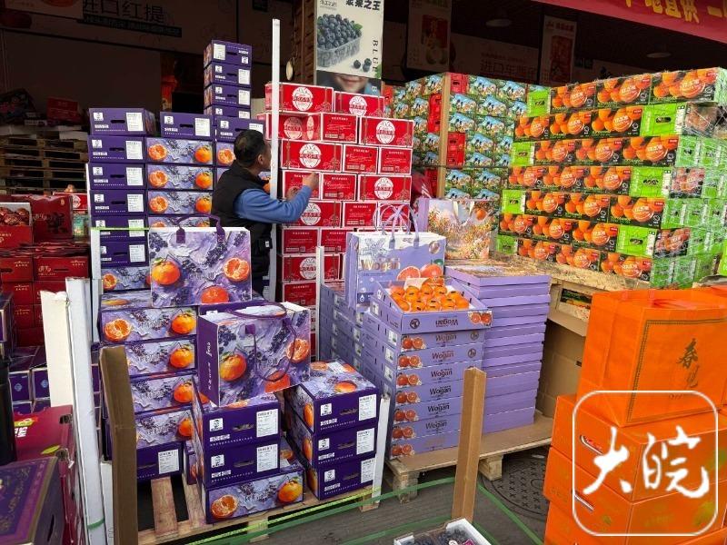 2月13日晚上,大皖新闻记者来到拱辰街,众多摊位前成箱成箱地堆着各类果品,不少市民在现场置办年货,一派热闹景象。一位商户告诉记者,现在已经进入了节前消费旺期,无论是车厘子、草莓、奇异果等精品水果,还是春见柑橘、砂糖橘这类平价水果,目前的销量都很好,为了迎合节前的消费需求,所有的水果都有礼盒包装以便顾客走亲访友送礼。