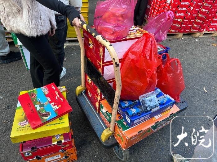 在水果交易中心大门附近的一处摊位前,商户们将成箱的水果整齐码放,橙黄的砂糖橘、青翠的甜枣、红润的溏心苹果堆叠如小山,吸引市民驻足挑选。在一处摊位前,商户正高声吆喝推介着自家的水果:“新到的春见柑橘,甜过蜜糖,70块钱一箱(9斤)!”记者注意到,许多市民推着露营小推车穿梭其间,车篮里塞得满满当当,孩童的嬉笑声、讨价还价的交谈声在此刻汇成节日乐章。
