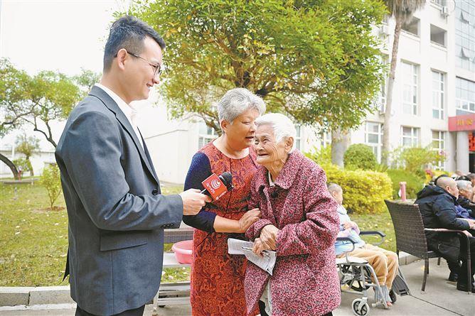 爱欣老年公寓的老人向记者(左)讲述入住体验。(厦门日报记者 许秋珩 摄)
