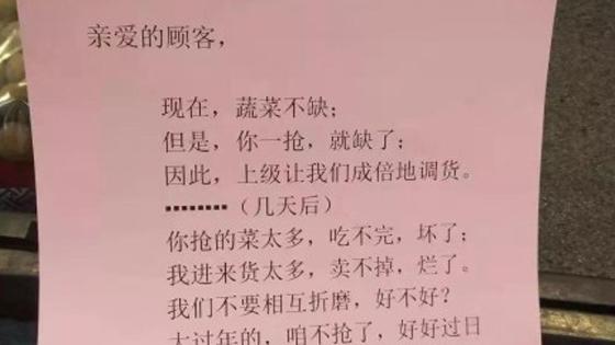 “蔬菜不缺,你一抢就缺” !超市贴海报呼吁不要抢菜