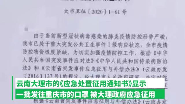 大理市征用扣留湖北黄石重庆医用物资:三十万只